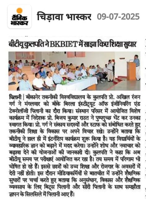 Bikaner Technical University (BTU) Vice Chancellor, Prof. Akhil Ranjan Garg, made an academic visit to B K Birla Institute of Engineering and Technology (BKBIET), Pilani, where he was accorded a grand welcome. In a special program organized on the institute campus, Prof. Bijay Kumar Rout, Director of BKBIET, extended a warm welcome to the Vice Chancellor by presenting a flower bouquet.