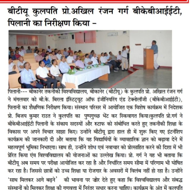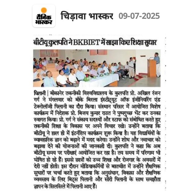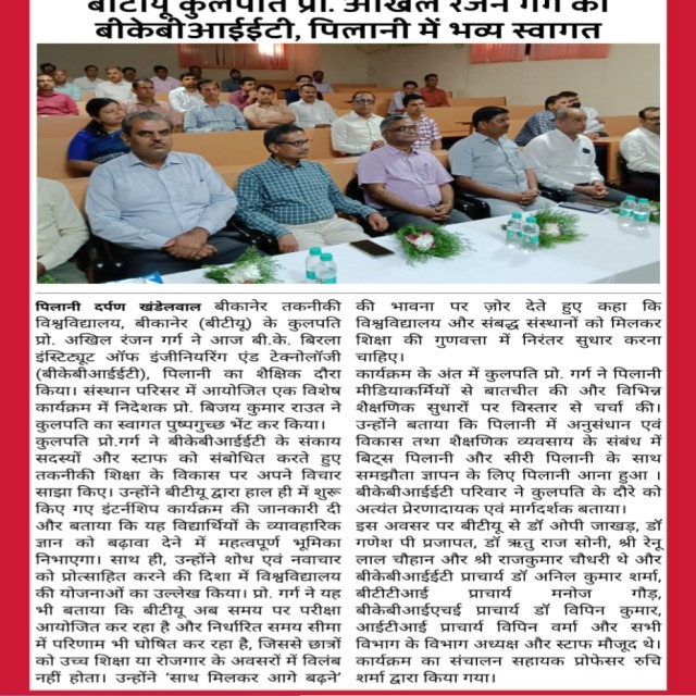 Bikaner Technical University (BTU) Vice Chancellor, Prof. Akhil Ranjan Garg, made an academic visit to B K Birla Institute of Engineering and Technology (BKBIET), Pilani, where he was accorded a grand welcome. In a special program organized on the institute campus, Prof. Bijay Kumar Rout, Director of BKBIET, extended a warm welcome to the Vice Chancellor by presenting a flower bouquet.