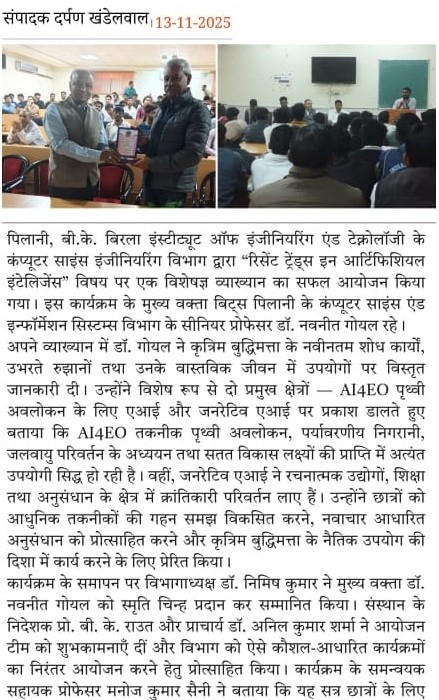 The Department of Computer Science Engineering, B. K. Birla Institute of Engineering and Technology (BKBIET), Pilani, organized an expert talk on the topic “Recent Trends in Artificial Intelligence (AI)”. The session was delivered by Dr. Navneet Goyal, Senior Professor, Department of Computer Science and Information Systems, BITS Pilani, Pilani Campus.