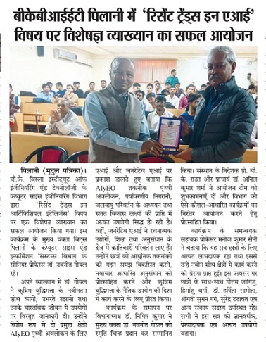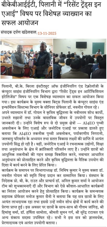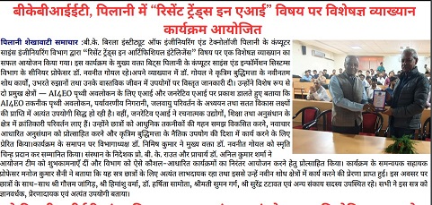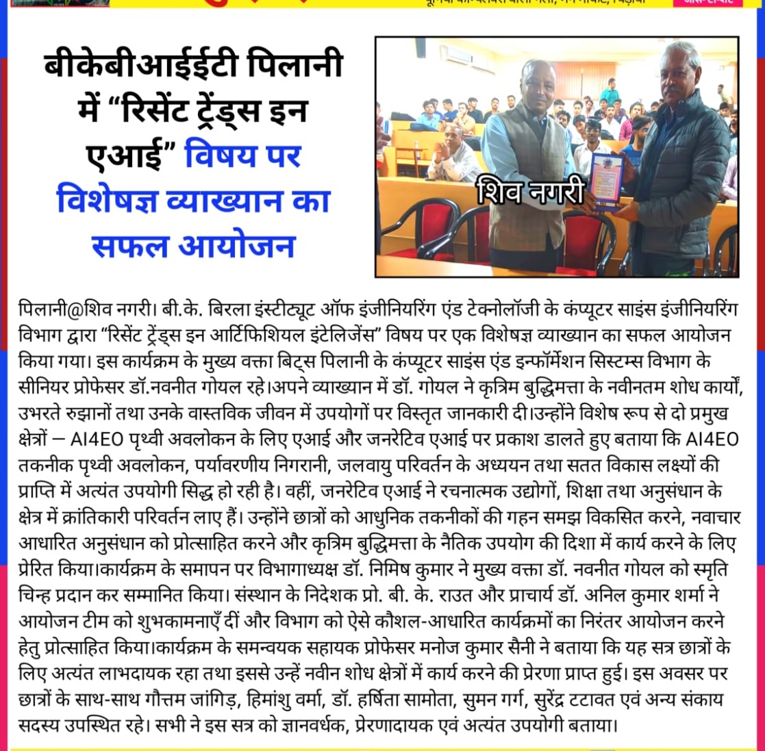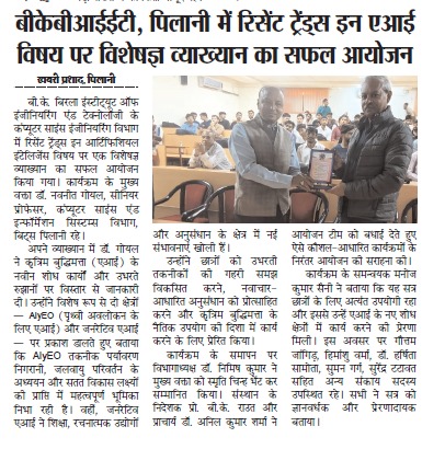 The Department of Computer Science Engineering, B. K. Birla Institute of Engineering and Technology (BKBIET), Pilani, organized an expert talk on the topic “Recent Trends in Artificial Intelligence (AI)”. The session was delivered by Dr. Navneet Goyal, Senior Professor, Department of Computer Science and Information Systems, BITS Pilani, Pilani Campus.