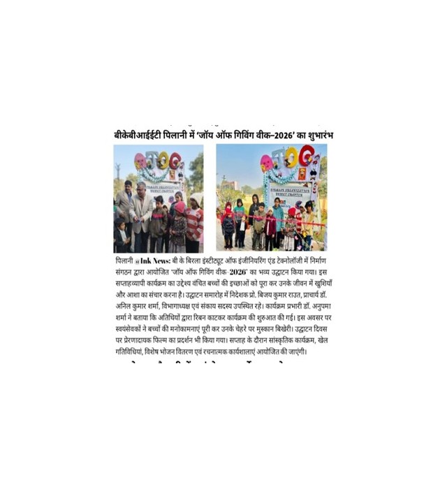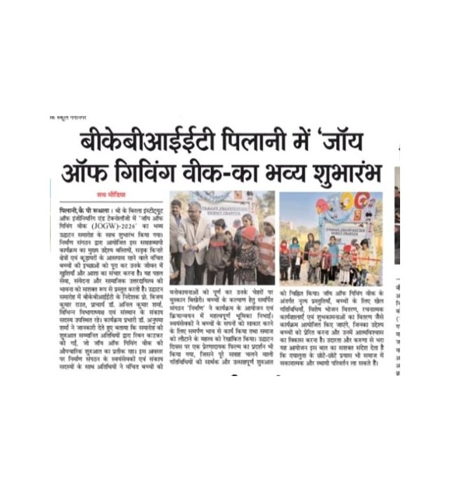 BK Birla Institute of Engineering & Technology, Pilani organized Joy of Giving Week (JOGW) 2026 from 21st to 23rd January 2026 in collaboration with Nirmaan Organization. The event was conducted with the objective of sensitizing students towards social responsibility and contributing to the welfare of underprivileged children through structured social engagement activities.