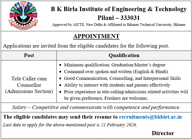 | The eligible candidates may send their resume to recruitments@bkbiet.ac.in