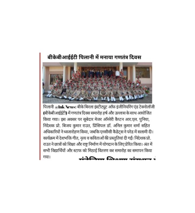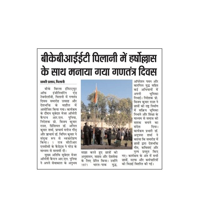 The Institute celebrated the 77th Republic Day of India with great enthusiasm and patriotic fervor on 26th January 2026 at the campus premises. The event was organized by the Cultural Committee in coordination with NCC. The chief guest guest of the event was Subedaar Major Honorary Captain R. L. Punia. The celebration commenced with the hoisting of the National Flag by the Director, Principals (BGI, Pilani) and the chief guest. Later it was followed by the singing of the National Anthem. This solemn moment filled everyone present with a deep sense of pride and respect for the nation.