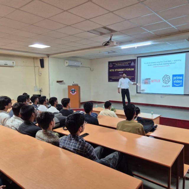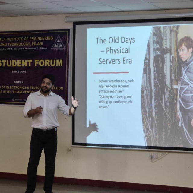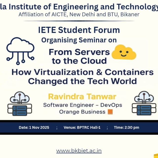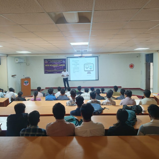 The IETE Student Forum (ISF), in collaboration with the Digital Media Cell, successfully organized a seminar on “From Servers to the Cloud — How Virtualization and Containers Changed the Tech World” on 1st November 2025 at BPTRC Hall 1. The objective of this seminar was to enhance students’ understanding of modern technologies such as cloud computing, virtualization, and DevOps, which are transforming the IT landscape.
